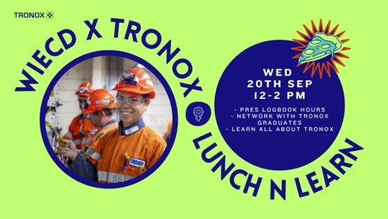 Welcome to WiCED x Tronox Lunch and Learn  Discover the World of Inorganic Minerals and Chemicals! Join us for an engaging Lunch and Learn session by Tronox, a global leader in mining, production, and marketing of inorganic minerals and chemicals. Drop by to have a chat with attending Tronox graduates and get a glimpse of the career pathways, graduate program as well as vacation work opportunities!  Event Details   Date: Wed 20th Sept  Time: 12-2pm  Location: Curtin University 215.302  Lunch Provided: Yes  Cost: $5 Limited Seats Available! Secure Your Spot Now!